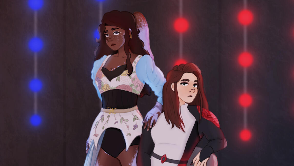 Dox loses her parents to a crash when she's a young teen. Vira's parents quickly take her in and raise her as their own. Rising costs and tensions across the galaxy mean that both Dox and Vira have to drop out of public school in order to do odd jobs in the Underworld full-time. Vira begins carrying vibrosickles-- two sickle-shaped knives that act as both a weapon and a device to slide across cables with. The two also discover their passion for dancing and performing, and they take tips (and bribes) at local clubs they've snuck into.