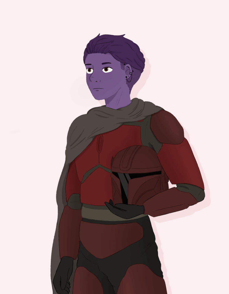 Judith Jenn is a Mandalorian Keshiri1 man and the former heir to his family's rule. As the youngest son, he is expected to hone every skill possible-- piloting ships, cooking, speaking, and of course, combat. He is 5’9 with purple skin/hair and deep red armor. His mother, the current matriarch, aligns herself with Mandalorian terrorists and the Empire thereafter. During the Siege of Mandalore2, Judith and his father-- unknown to his mother-- reject those alliances and fight for the Republic instead. His father dies in the firefight. When he brings up his disagreements years later, his mother is furious; Judith is exiled from Kesh and his family. Quickly, he packs up and leaves.