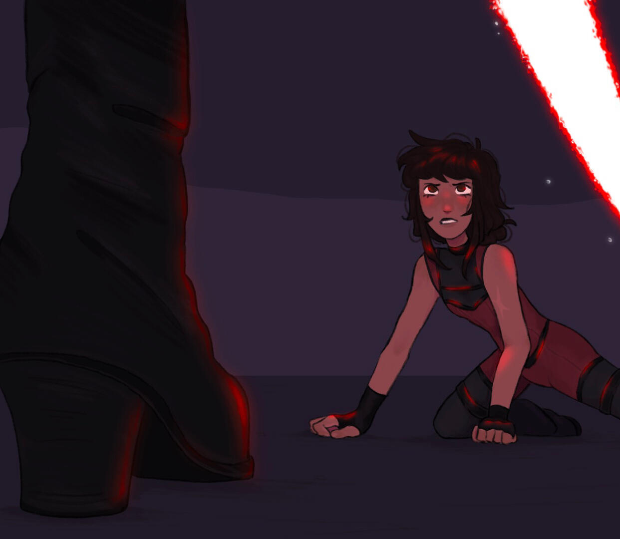 Coruscant quickly becomes too dangerous for both of them. They flee together, but Kira continues her career in an effort to protect her public image from suspicion. Roughly a year later, Adrien-- now an Inquisitor1-- tracks Lilith down in an effort to either persuade her or kill her. A vicious fight leads to a lightsaber stab wound through Adrien's abdomen, but not before she fatally slashes Kira across the back. Lilith must reach into the Force in order to heal Kira enough that she survives her wounds.